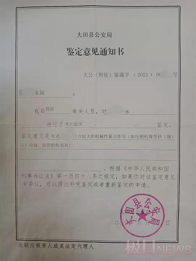然而黄永成并不认可这份《鉴定意见通知书》。“我爸爸的胸口和背上并无明显伤痕,十几吨重的挖掘机碾在人身上,人都能被压扁了。”黄永成说,反倒遗体被发现时,他看到父亲头部有伤痕。