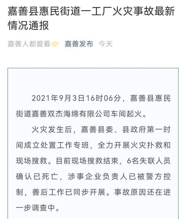 9月4日凌晨,据嘉善发布消息,2021年9月3日16时06分,嘉善县惠民街道嘉善双杰海绵有限公司车间起火。火灾发生后,嘉善县委、县政府第一时间成立处置工作专班,全力开展火灾扑救和现场搜救。目前现场搜救结束,6名失联人员确认已死亡,涉事企业负责人已被警方控制,善后工作已同步开展。事故原因还在进一步调查中。