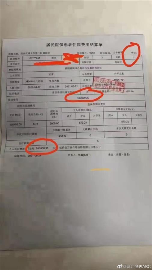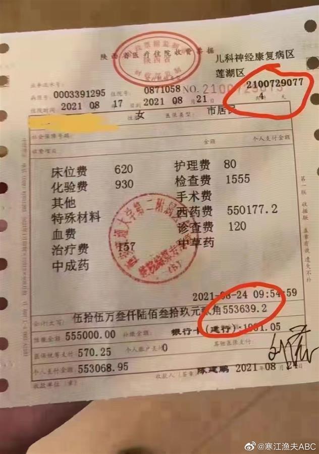 网传的这张票据,显示为“陕西省医疗住院收费票据”。患者的治疗时间在2021年8月17日至2021年8月21日。治疗病区显示为儿科神经康复病区。
