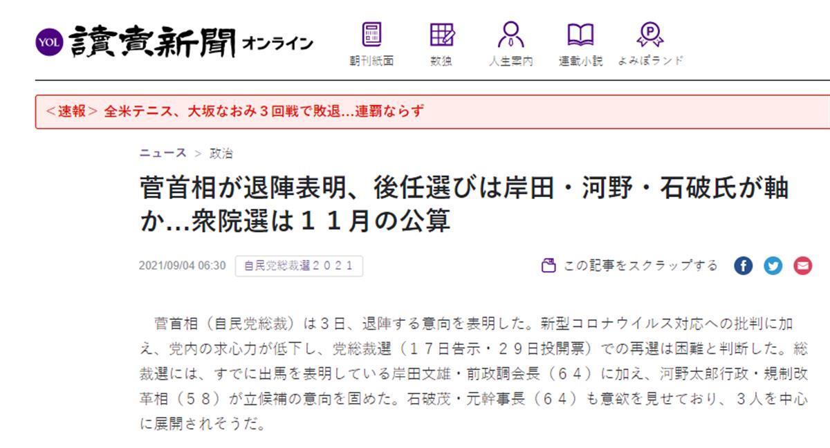 据日本《读卖新闻》报道,当地时间9月3日,日本首相菅义伟宣布,不参加自由民主党总裁、即党首选举,理由是要集中精力应对新冠疫情。日媒分析,11月举行选举正在成为一种可能。日本前外相、自民党前政务调查会长岸田文雄,行政改革担当大臣河野太郎,前防卫大臣石破茂都是新首相的有力人选。