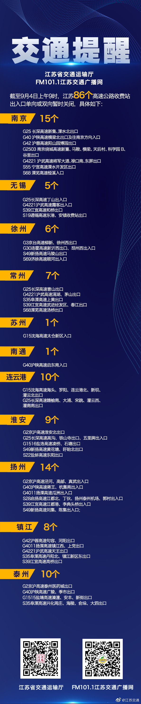 央视网消息:据江苏省交通运输厅官方微博消息,全省高速公路运行总体平稳。截至9月4日上午9时,南京、无锡、徐州、常州、苏州、南通、连云港、淮安、扬州、镇江、泰州等地区86个高速公路收费站出入口单向或双向暂时关闭,具体如下: