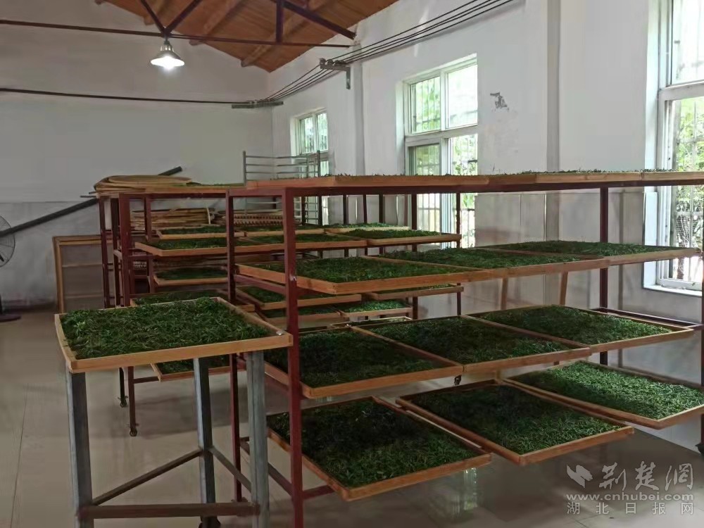 走进孝昌县邹岗镇青桥村尚多茶庄,绿水青山成为这里的底色。漫山遍野间绿油油的茶树联排连片,行走在茶山里,茶香四溢,沁人心脾。几十名采茶工人提着竹篮在茶园分散开来,随着指尖轻快的拈动,不一会,胳膊挽着的竹篮已装满了新茶。与此同时,在茶叶加工厂,两名工人正将茶叶筛里的新茶进行覆干加工。随着双手熟练的翻炒,清幽的茶香弥漫了整个厂房。