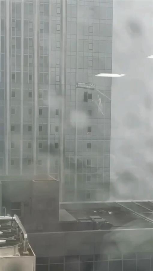 网传有两段现场视频。其中一段视频显示,大雨中,一栋大楼的吊篮被风吹离,越过了马路,伴着一声巨响,围观人员向后躲避。另一段视频显示,另有一处吊篮也在空中大幅摆动,有多段管状物在摆动过程中从篮中洒落,砸向地面。
