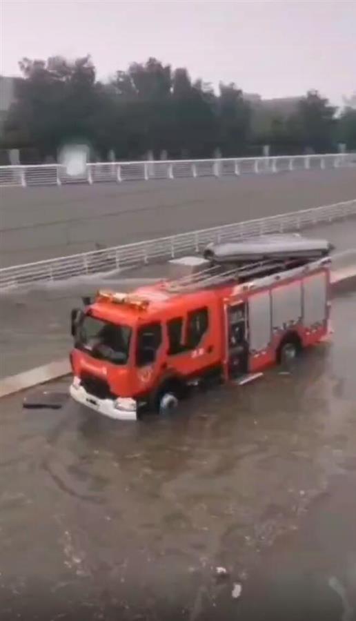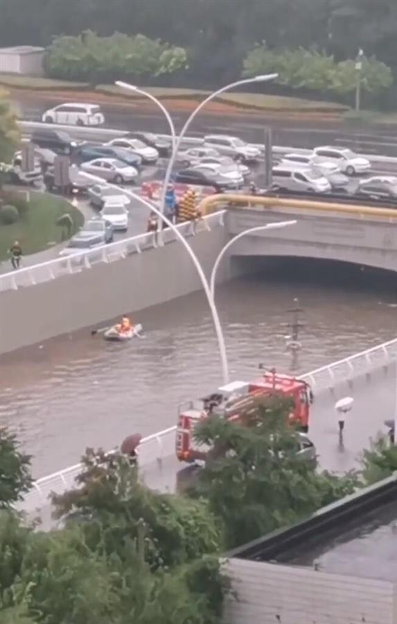 有视频显示,镇海桥地道的积水已灌满隧道口。另一段视频显示,有消防车停在隧道上方的路段,救援人员穿戴救生衣划着皮划艇在积水中营救。