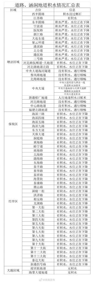 滨海区道路、涵洞地道积水情况汇总表(图源:滨海发布)
