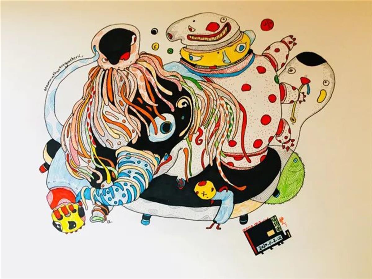 极目新闻记者看到,小动物、小怪兽是Mr.Q画作里最频繁出现的主体,这些小生物在他的笔下总是“又怪又美的”,恰如那只凝视所有人的出圈雄鸡。