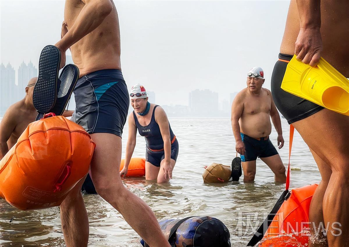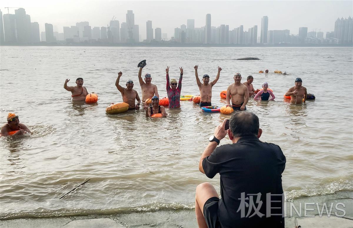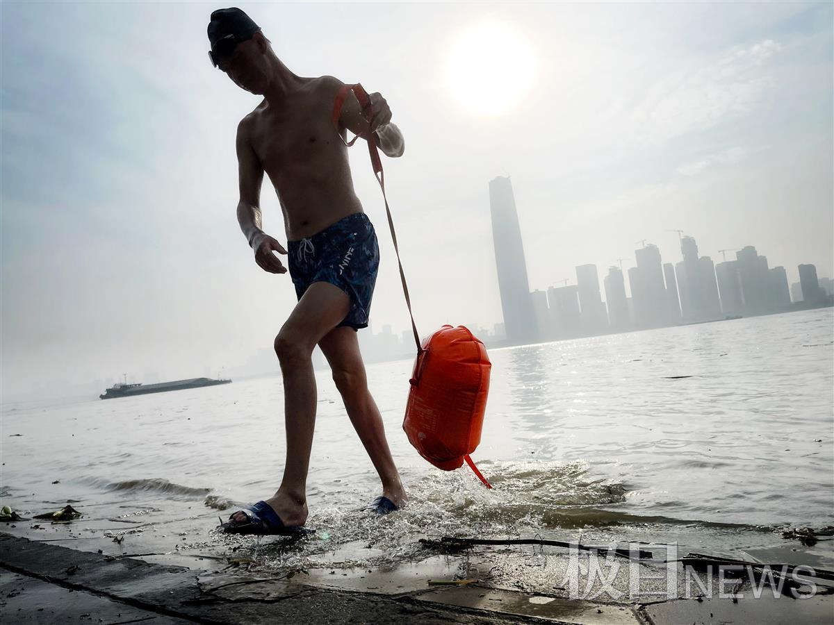9月4日上午,武汉汉口江滩边,一群刚刚完成渡江的人们正在合影留恋,他们从武昌汉阳门下水,汉口江滩起水,圆满完成了此次渡江。