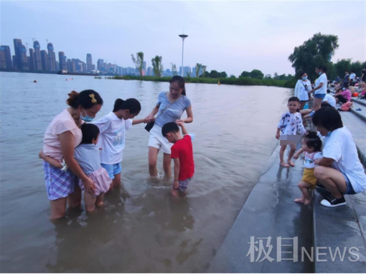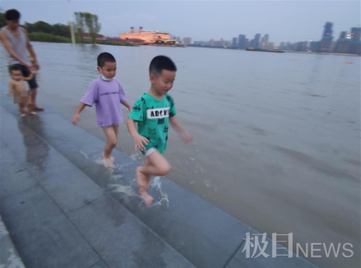 初秋如夏,市民喜到江水浸泡的汉口江滩三阳路广场没入江水的低层亲水平台戏水。