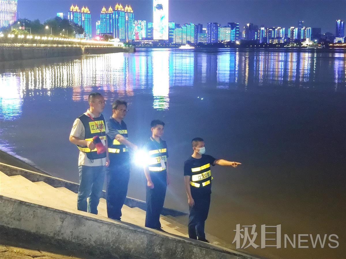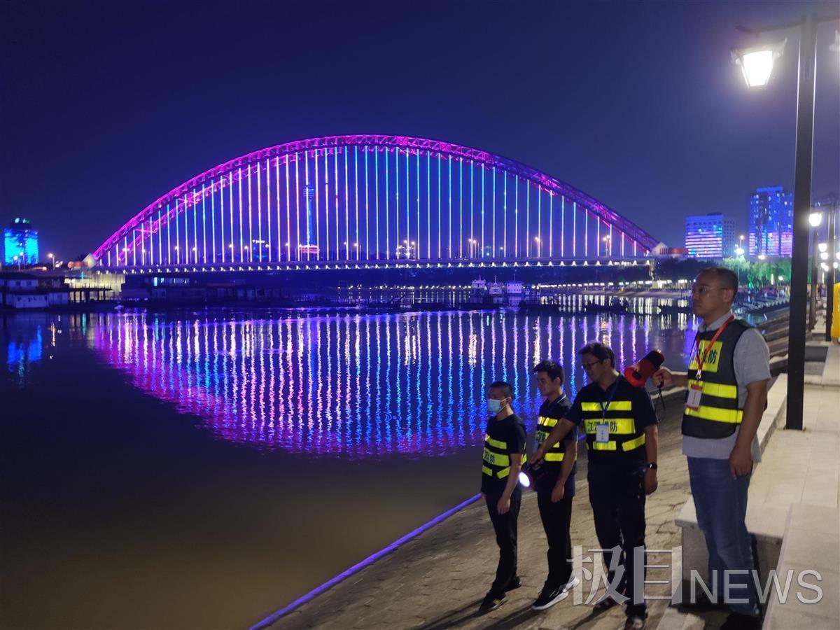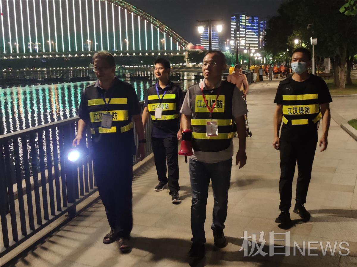 9月4日晚,汉江新沟站水位达28.45米。江汉区水务和湖泊局防汛人员在汉江集家嘴堤防巡查、值守。
