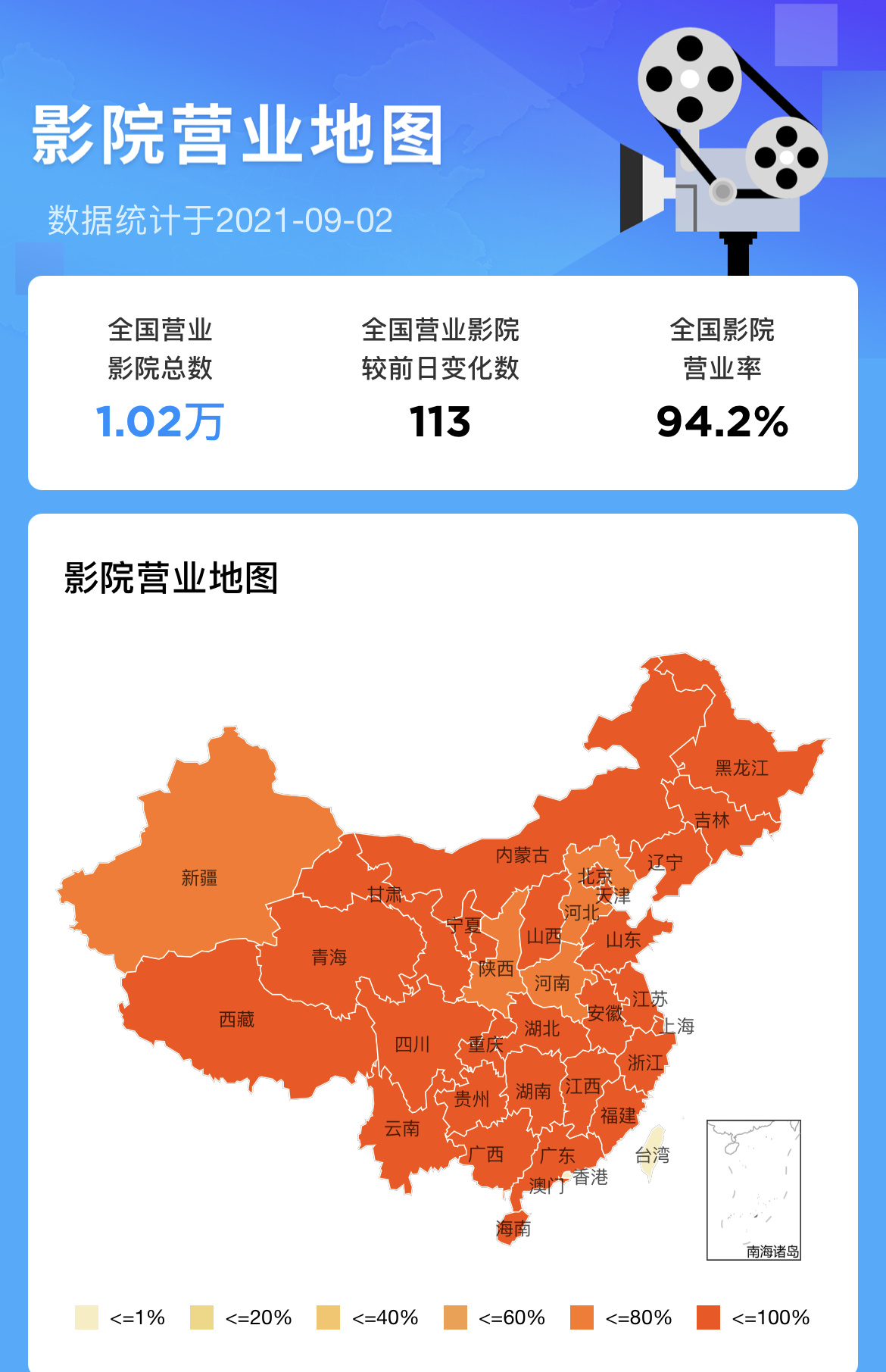 与此同时,全国多地影院也正在恢复营业。记者从灯塔专业版上看到,截至9月3日,全国营业影院总数达1.02万,营业率达94.2%,较前日增加113家。从趋势图上看到,基本恢复到疫情以来的平均水平。