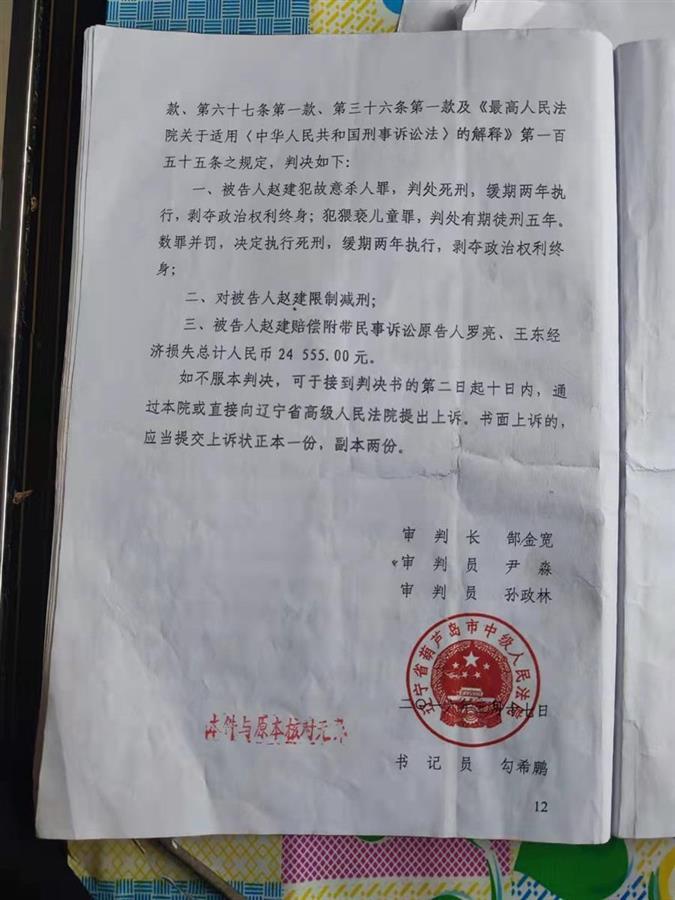 2018年9月18日,葫芦岛中院一审重审判决书显示,法院认为,关于赵某具有自首情节的辩护意见,经查,赵某在公安机关如实供述了罪行,但在庭审中对故意杀人的主要事实翻供,不能认定为自首。判决赵某犯故意杀人罪、猥亵儿童罪,数罪并罚,决定执行死刑,缓期2年执行;赔偿罗亮、王东经济损失共3.1万余元。
