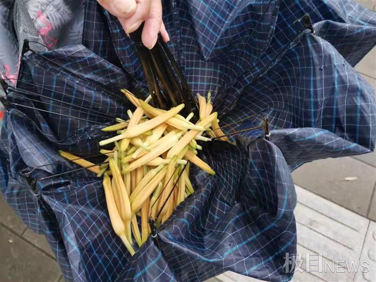 9月2日上午,一位打伞的女士行至武昌区右岸大道(临江大道)武车路至四马路段时,发现绿化带中开满了橘黄色的花朵,看上去像黄花菜,于是伸手采摘了数十朵还未开花的花苞,然后将伞倒立,盛放“黄花菜”。