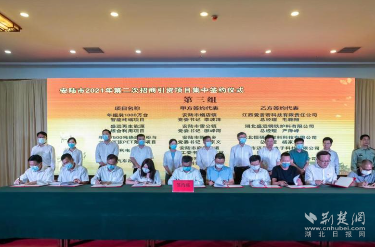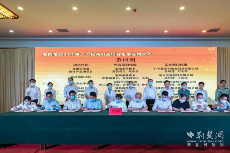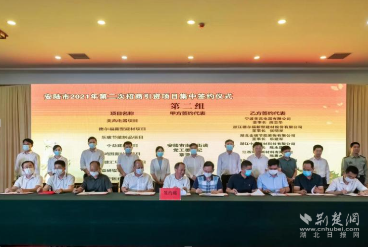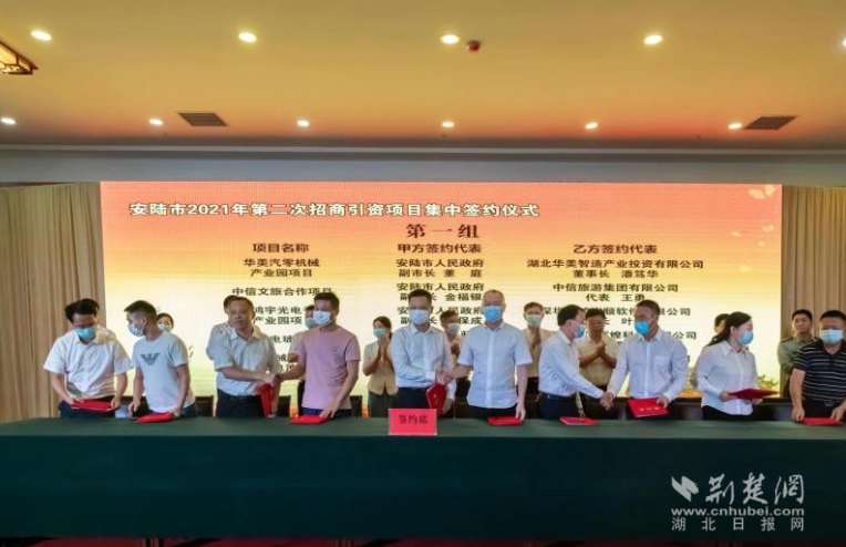 荆楚网(湖北日报网)讯(通讯员吴焱、骆骥)9月4日,安陆市举行“安陆市2021年第二次招商引资项目集中签约仪式”,成功签约项目43个,投资总额106.6亿元。其中,过亿元项目25个、过10亿元项目2个。签约项目涵盖了智能制造、新型材料、商贸物流、文化旅游等多个领域,产品科技含量高,产业关联度强,对延伸安陆产业链条、加快优势产业集聚、增强经济发展后劲具有重要的意义,为安陆经济高质量发展注入强劲动力。