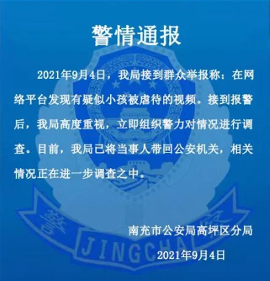 当天,南充市公安局高坪区分局发布警情通报称,接群众举报,网络平台发现有疑似婴儿被虐待的视频。目前,警方已将当事人带回公安机关,相关情况正在进一步调查之中。