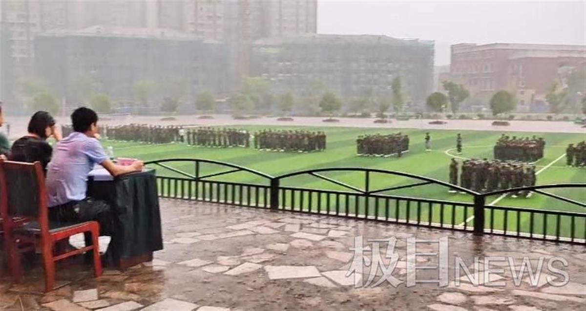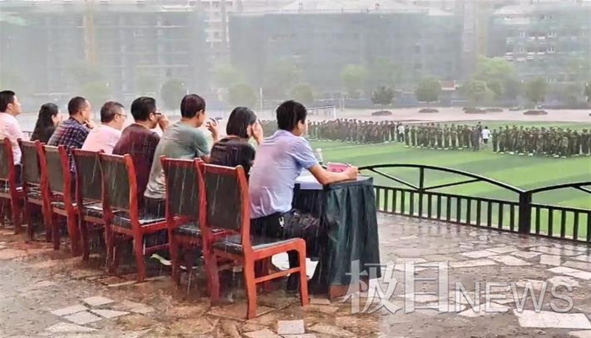 视频中,军训汇演现场下起了大雨,学生们正在操场进行军训演练,多位学校领导坐在主席台上,未打雨伞未穿雨衣,已经浑身湿透,仍坚持淋雨观看军训汇演,无一人离开座位。