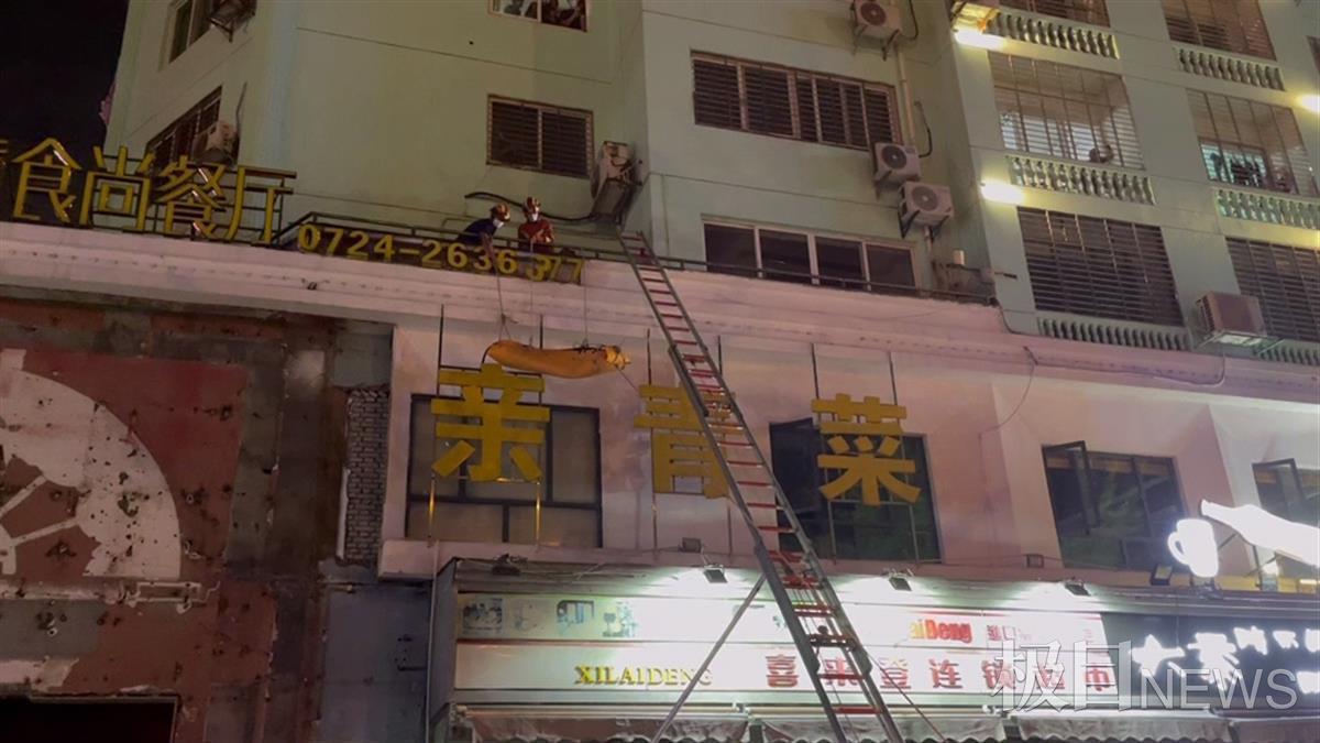 19时08分,消防救援人员到达现场后发现,在3楼空调外机平台平躺着一名男性,平台周围树立着广告牌。现场指挥人员了解了具体情况后,一名救援人员通过索降的方式从5楼窗户降到3楼平台,发现跳楼男子后脑勺受伤,为不造成二次伤害,救援人员一边小心翼翼地将跳楼男子转移到多功能担架上固定,另一边在一楼架起了15米金属架体,使用绳索将成功将被困男子垂直下降到一楼地面,随即移交现场医护人员送往医院进行救治。