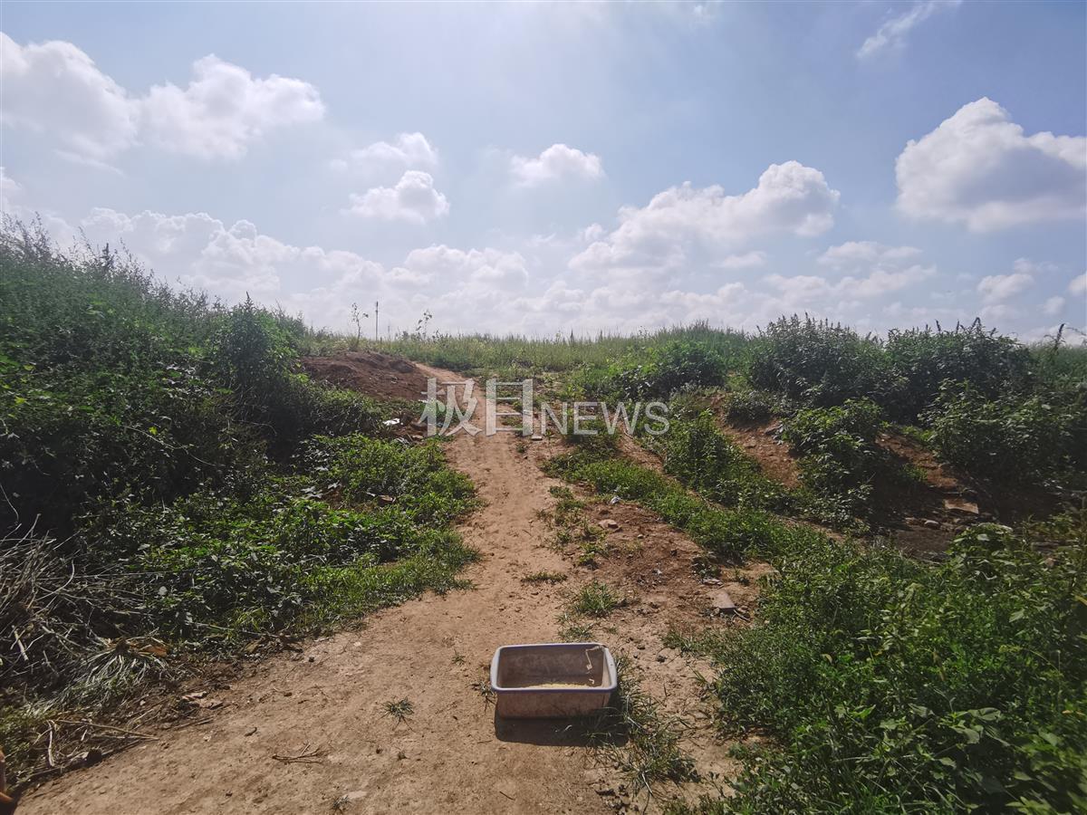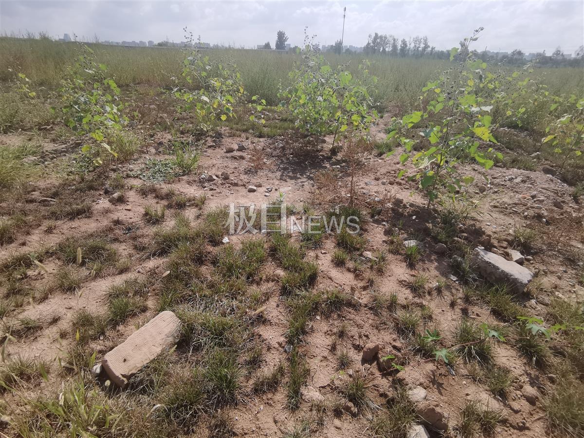 沿着土坡往上走,极目新闻记者踏上这块高地。发现该地块地表被黄土覆盖,上面稀稀拉拉的长着草类植物。没有看到普通耕地应该有的田埂、水沟,反而隐约可以在地面看到部分裸露的建筑垃圾。