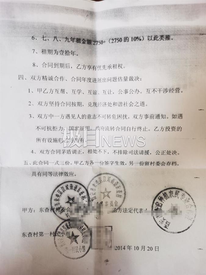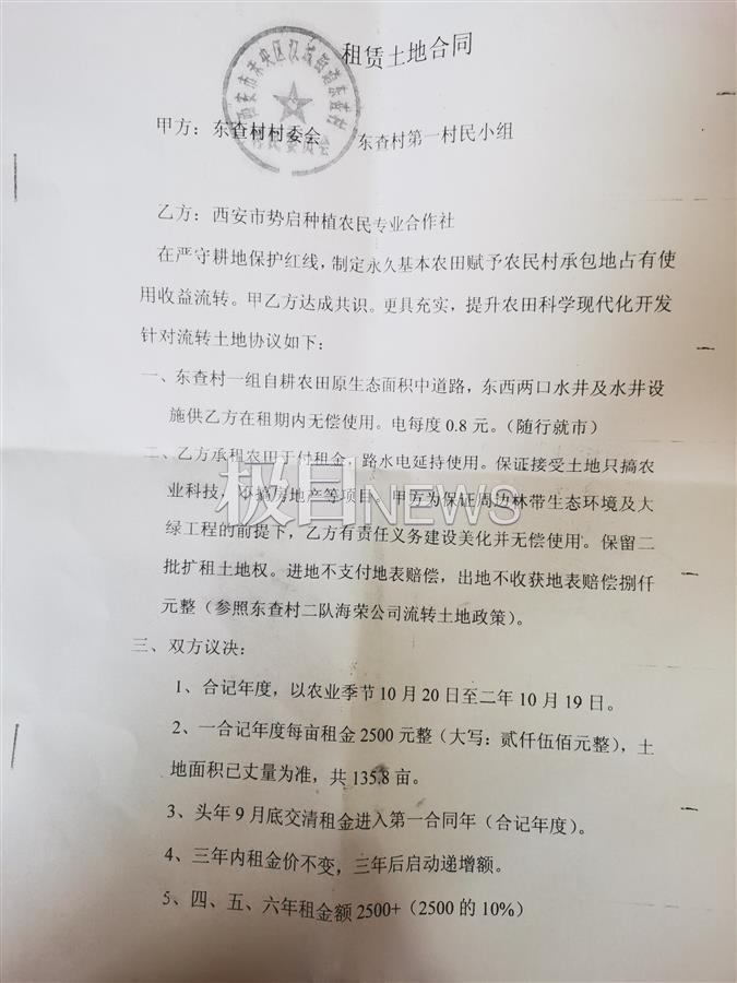村民介绍,2014年10月20日,东查村村委会第一村民小组与西安市势启种植农民专业合作社签订了租赁土地合同。