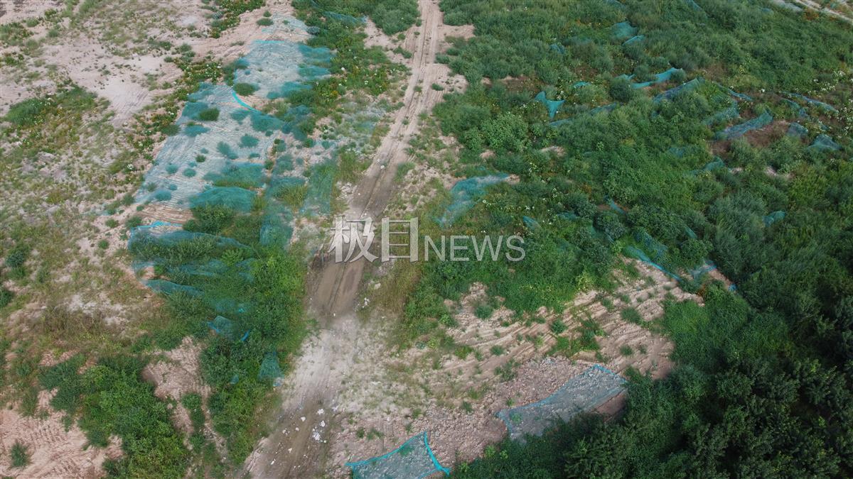 极目新闻记者通过航拍发现,这块黄土地面积非常大。通过空中的镜头,还可以看到有残留的覆盖在地面的绿布。村民称,这是村里当时应付检查时所铺设。