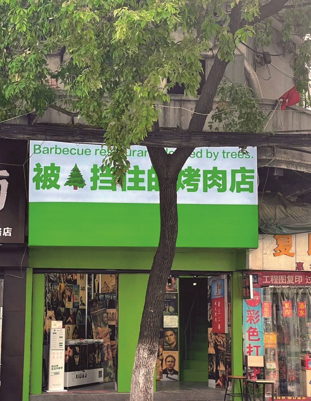 晚7时许,记者依着导航远远地就看到这家招牌醒目的烤肉店,店外,一棵弯曲的大树挡在店前,从店内飘出的烤肉香气扑鼻而来,不少正在排队等候的食客同样是被这有趣的名字吸引而来。店面灯光招牌字样用大号绿色字体,“树”字则用一棵小松树代替,显得格外引人注目(如图)。