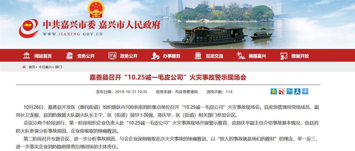 嘉善县政府官网显示,当时,嘉善县开发区(惠民街道)组织辖区内100余家消防重点单位召开“10.25诚一毛皮公司”火灾事故现场会。会上组织企业负责人赴“10.25诚一毛皮公司”火灾事故现场开展警示教育,并进一步分析事故原因,与会企业深刻吸取此次火灾事故的惨痛教训,以“别人的事故就是我们的教材”的理念,举一反三,进一步落实企业消防隐患排查治理闭环的主体责任。