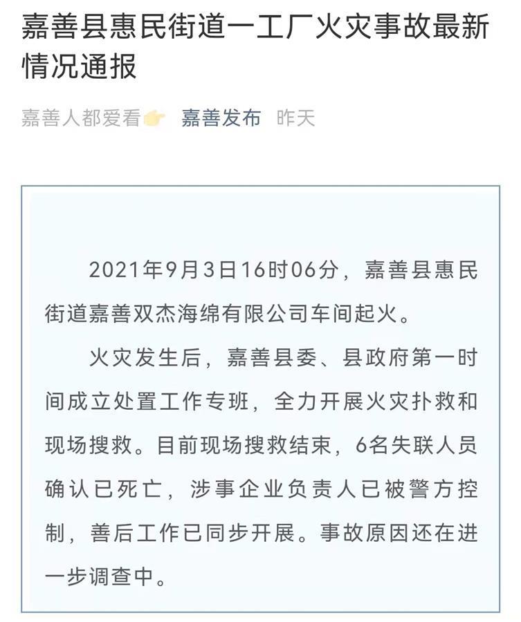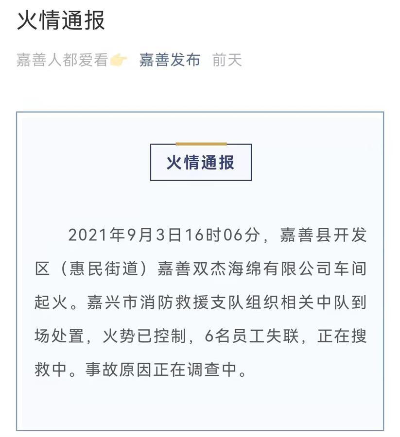 9月3日7时6分,嘉善官方发布消息称,当天16时06分,开发区(惠民街道)嘉善双杰海绵有限公司车间起火,6名员工失联。