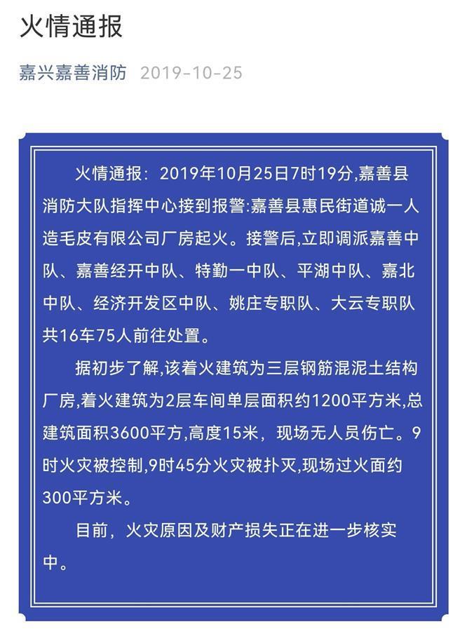 2019年10月25日早上7时,嘉善县惠民街道诚一人造毛皮有限公司厂房起火。嘉善消防出动16车75人处置,9时45分火灾被扑灭,现场过火面约300平方米,无人员伤亡。