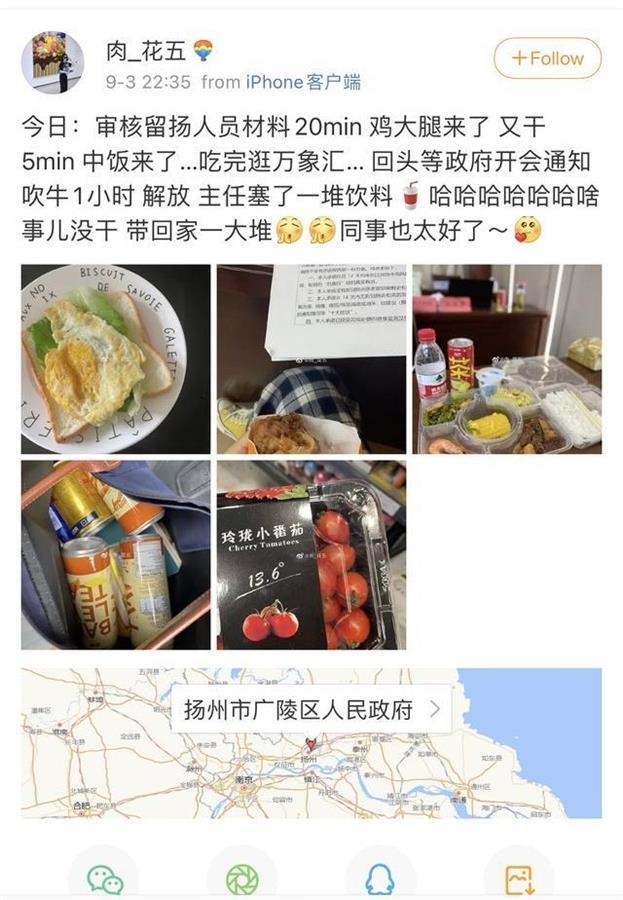 相关截图显示,网名为“肉_花五”的网友于9月3日发布微博大秀“工作福利”,声称自己在负责审核滞留扬州人员材料的工作时,不仅办公任务轻松,还“有吃有喝”能吹牛逛街。因该网友发博时定位在“扬州市广陵区人民政府”,其个人言论迅速引发公众关注和热议。