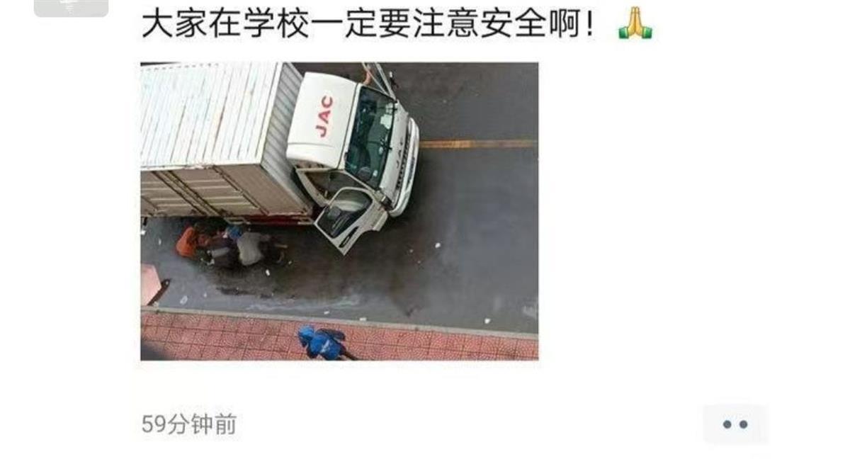 监控显示,上午8时45分左右,在虹远楼天井东侧出口附近,一辆快递货车在倒车时将车辆后方一名女生撞倒,并发生碾压。