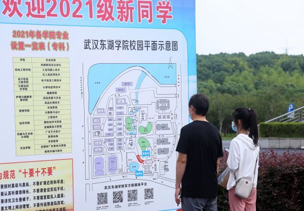 学校在醒目位置布置了相关指示牌、校园分布图。清晨6点,志愿者们已经在各自岗位上值守,他们热情地帮助新生搬运行李、引导路线、答疑解惑。学校还在武昌火车站、汉口火车站设立了迎新接待站,接站志愿者早上5点出发,组织新生乘坐接站大巴,秩序井然。