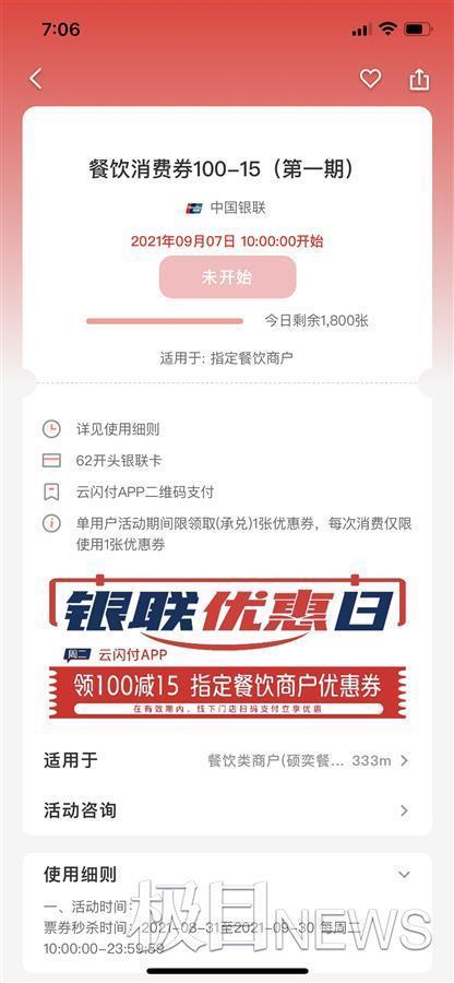 9月7日至9月30日,每周二上午10时,市民可通过云闪付APP领取面值不等的餐饮惠民消费券。领券后可以到湖锦酒楼、小蓝鲸、半秋山、靓靓蒸虾等指定餐饮门店进行线下扫码支付,即可享受餐饮门店优惠与本次消费券实时抵扣的双重叠加优惠。此外,想参加的餐厅可通过协会向银联申请,成为云闪付指定商户。