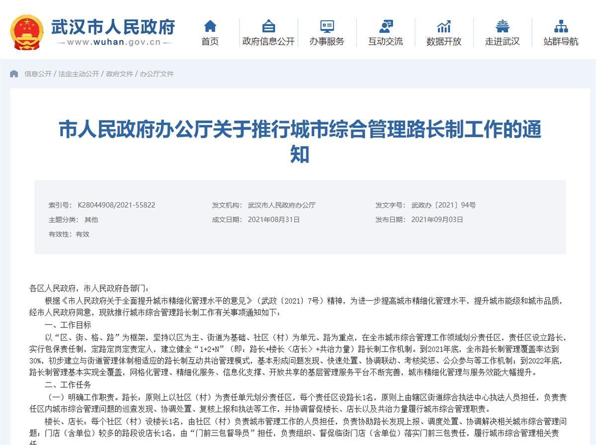 武汉有湖长,今后还将有路长。武汉市政府办公厅近日发出《关于推行城市综合管理路长制工作的通知》,提出到2021年底,全市路长制管理覆盖率达到30%,初步建立与街道管理体制相适应的路长制互动共治管理模式,到2022年底,路长制管理基本实现全覆盖。