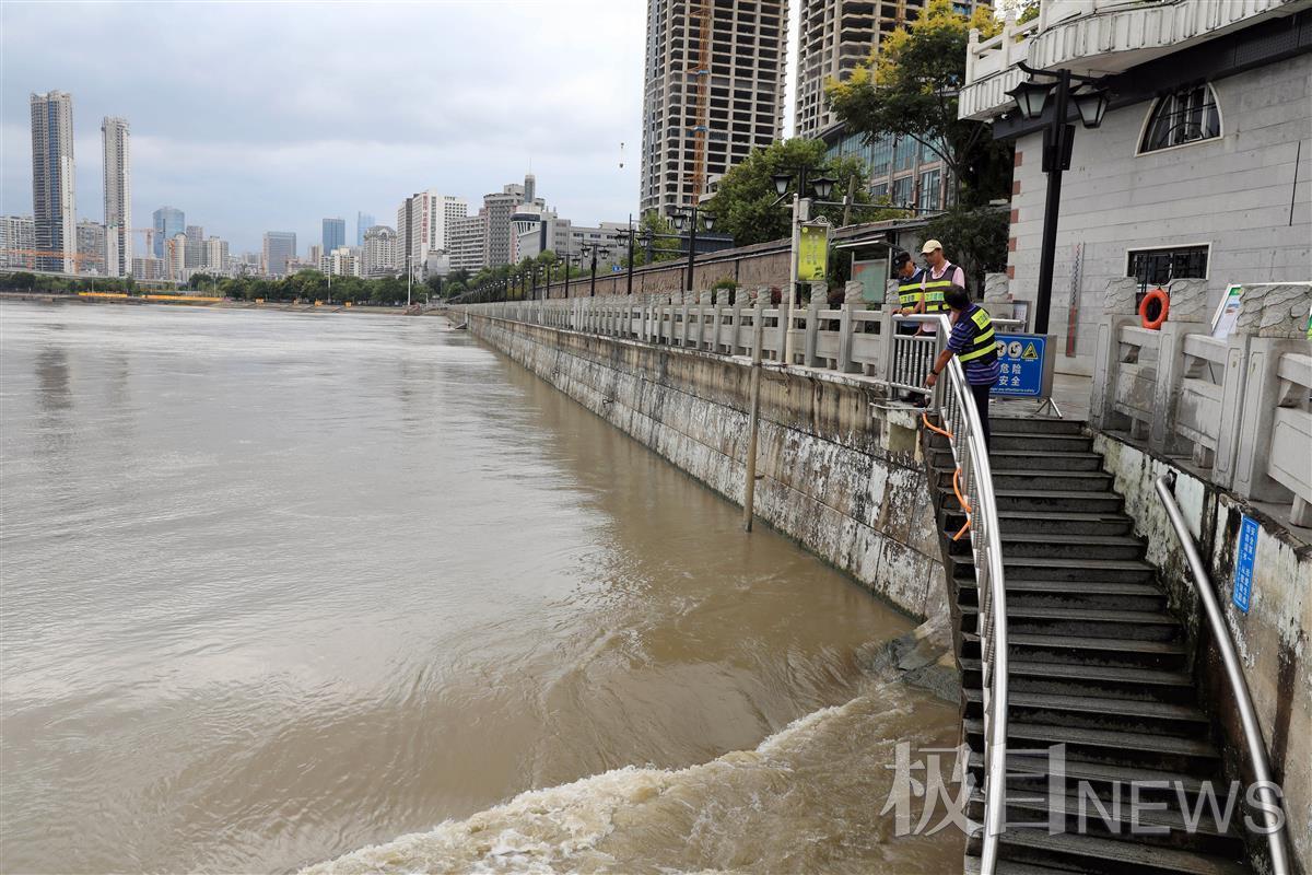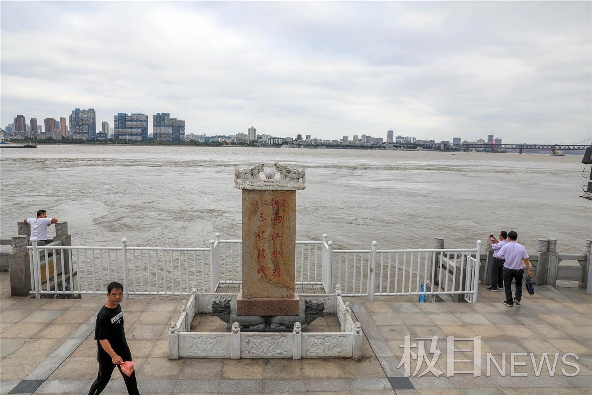 9月6日,极目新闻记者在汉口龙王庙段看到,汉江水位已涨至堤岸高处,水流湍急漩涡众多,吸引不少市民隔栏望江。