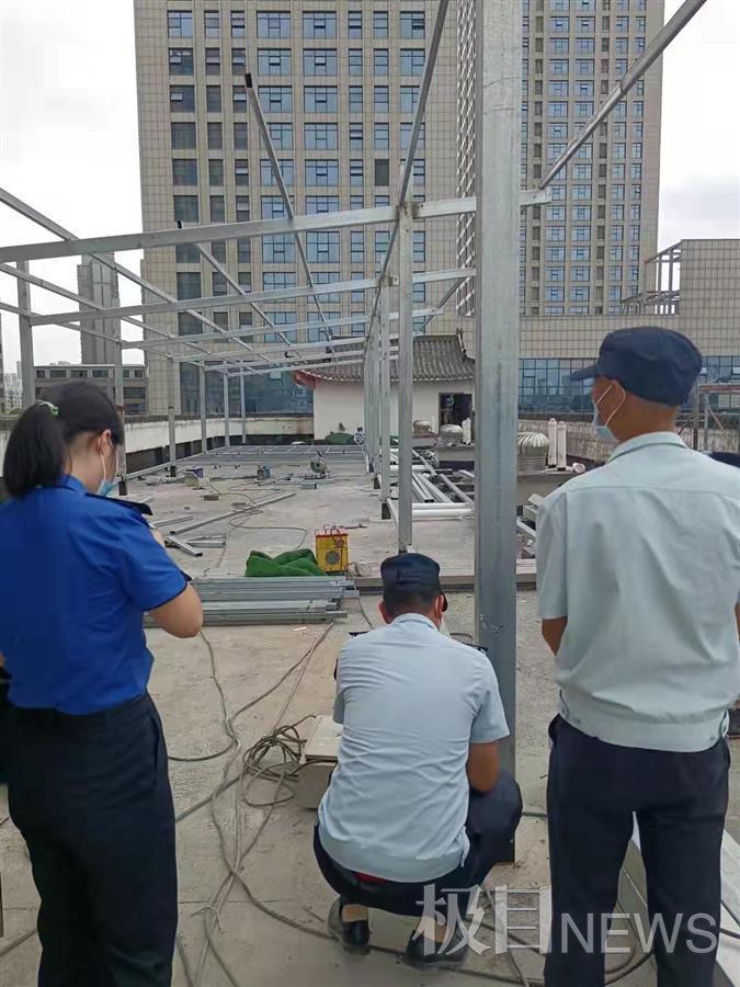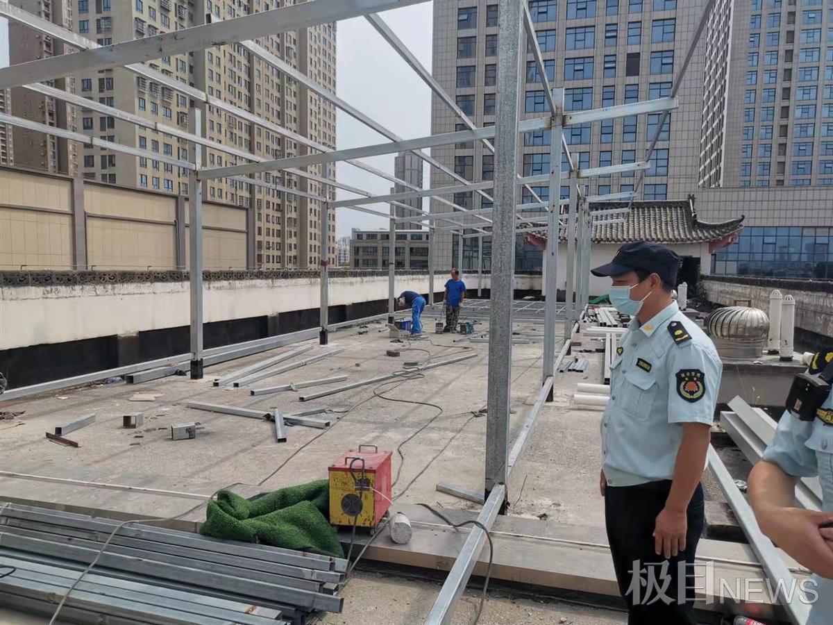 “装修为何要用吊车和蓝皮瓦?”如此与众不同,是否存在违建情况?队员们来到客房4楼楼顶,果然不出所料,现场发现有大面积的钢架结构的框架,施工人员正在搭建活动板房。