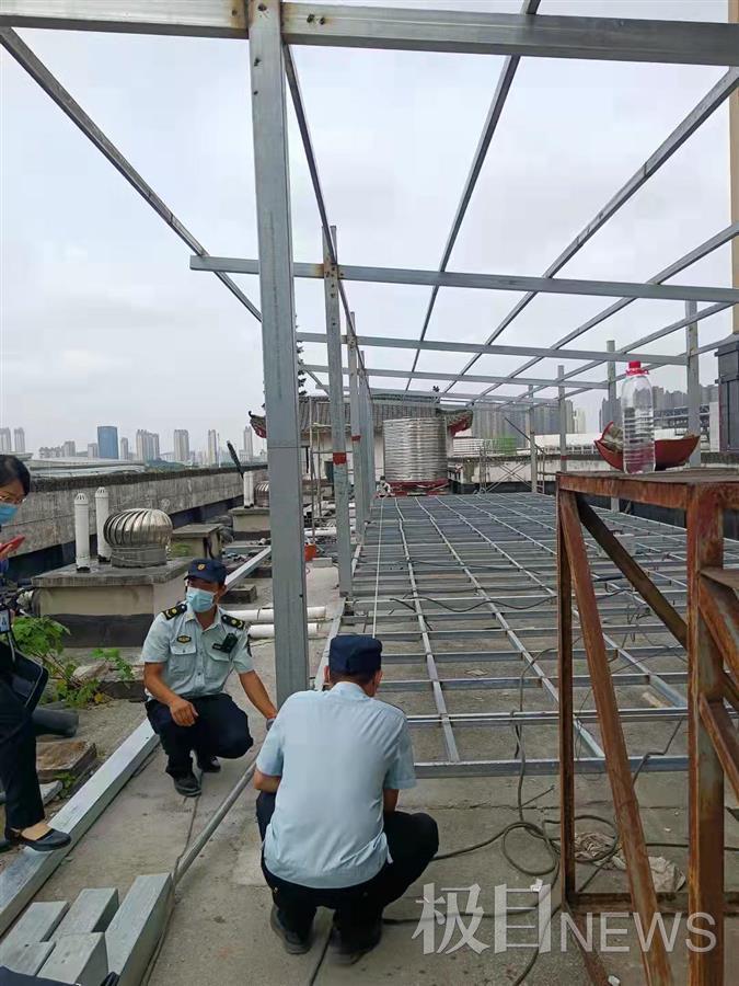 武汉市东西湖区径河街一家会馆,假借安装光伏发电机名义在楼顶进行违建,被东西湖区径河街城管执法队队员火眼金睛识破。9月6日,该酒店楼顶正在抢建的建构筑物已被依法拆除。