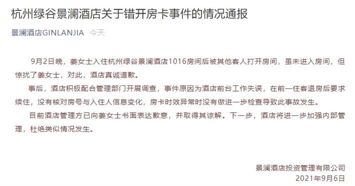 6日下午,酒店方发布情况通报称,9月2日晚,姜女士入住杭州绿谷景澜酒店1016房间后被其他客人打开房间,虽未进入房间,但惊扰了姜女士,对此,酒店真诚道歉。