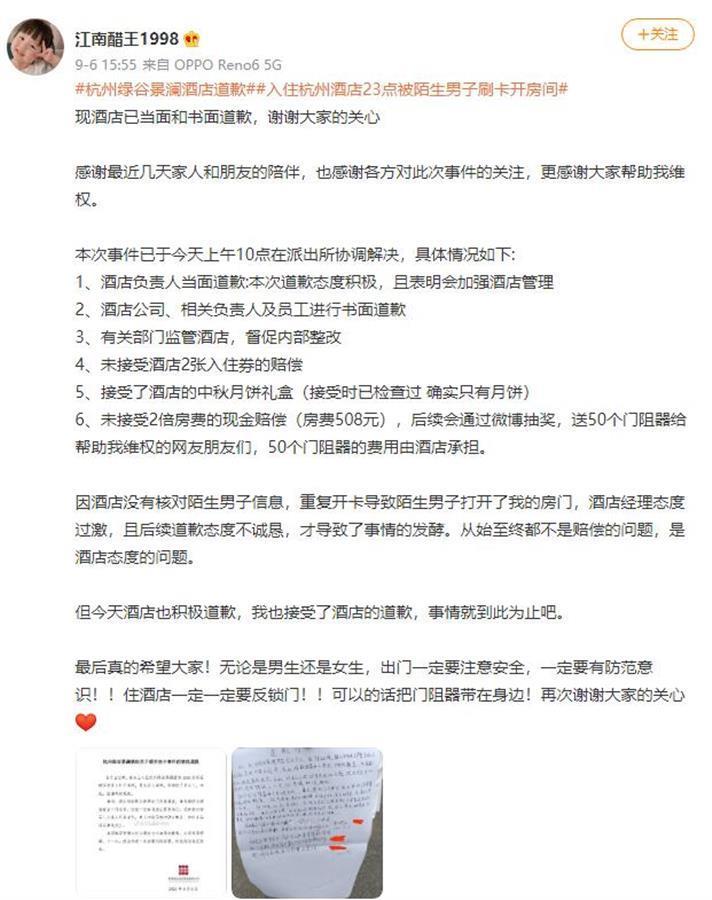 6日下午,当事女子发布微博称,此前酒店经理态度过激,且后续道歉态度不诚恳,才导致事态升级,从始至终都不是赔偿的问题,是酒店态度的问题。已于今天上午10点在派出所协调解决,接受了酒店的中秋月饼礼盒,未接受酒店2张入住券和两倍房费的现金赔偿(房费508元),后续会通过微博抽奖,送50个门阻器给帮助维权的网友朋友们,50个门阻器的费用由酒店承担。