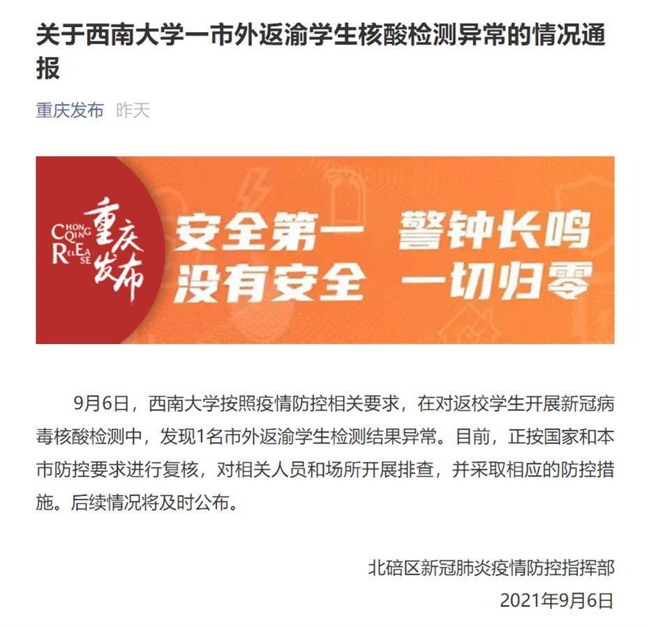 9月6日晚,重庆北碚区新冠肺炎疫情防控指挥部发布通告,称西南大学一市外返渝学生核酸检测异常。在西南大学内部,这一通知早在6日凌晨6点就已经传达到学生,一系列的防疫措施已经展开。