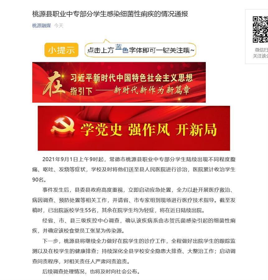 桃源县职业中专90名学生感染细菌形成痢疾(来源桃源融媒官微)