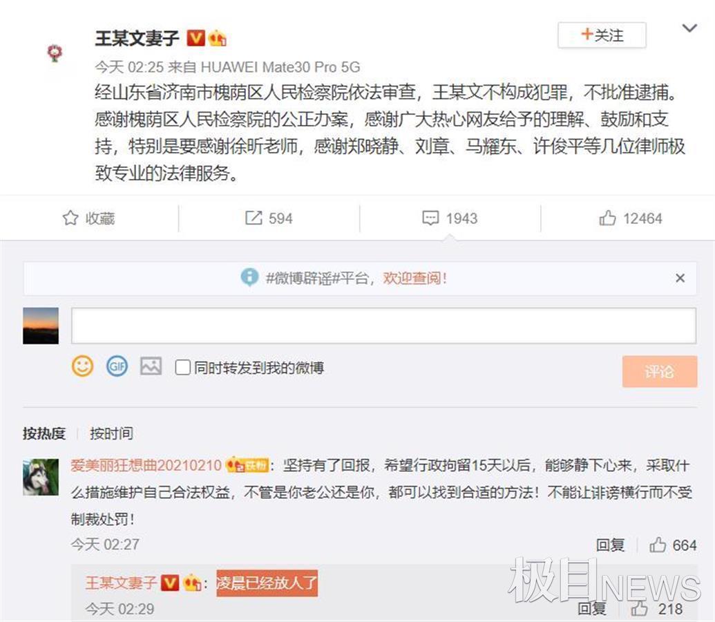 9月7日凌晨2时25分,王某文妻子在发微博称,“经山东省济南市槐荫区人民检察院依法审查,王某文不构成犯罪,不批准逮捕。感谢槐荫区人民检察院的公正办案,感谢广大热心网友给予的理解、鼓励和支持,特别是要感谢徐昕老师,感谢郑晓静、刘章、马耀东、许俊平等几位律师极致专业的法律服务。”