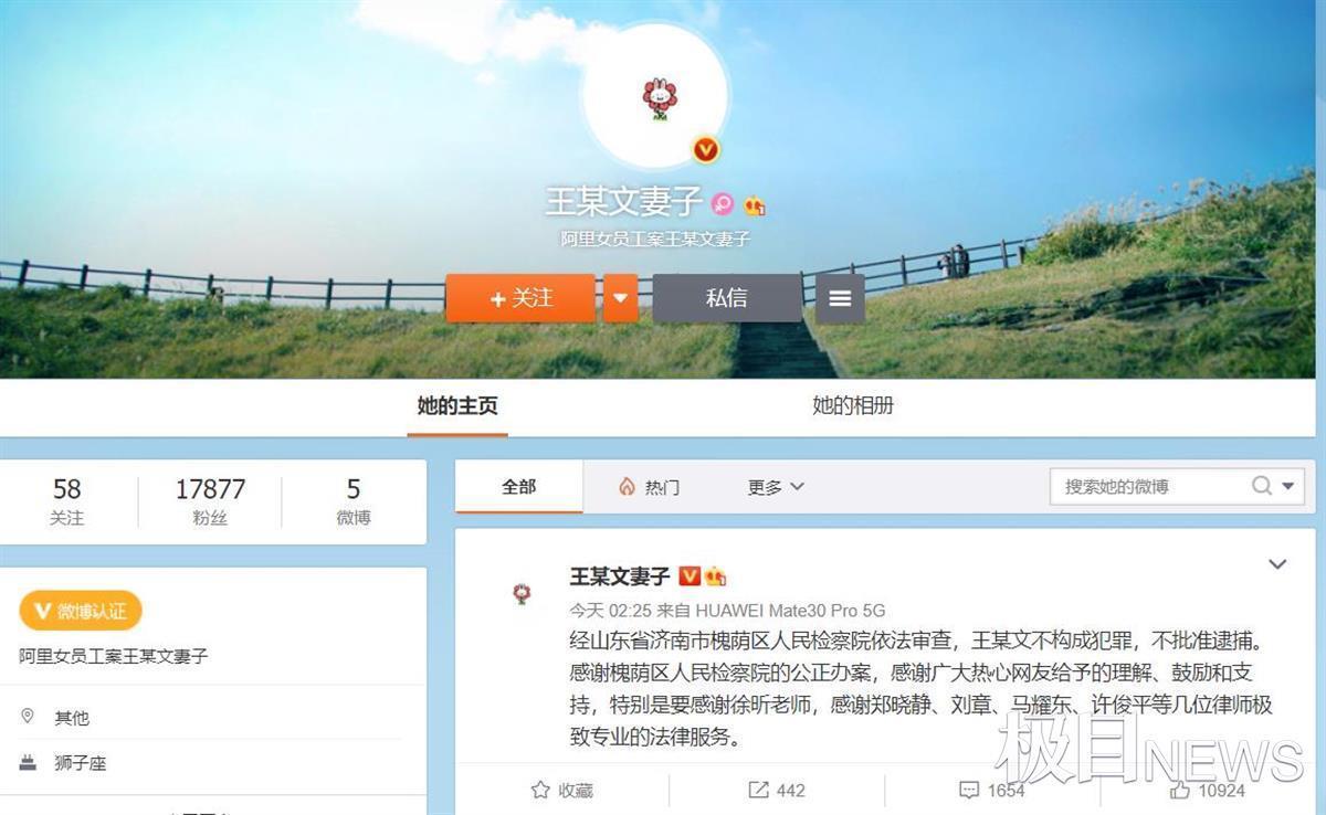 8月19日,微博认证为阿里员工王某文妻子的账号发布了第一条消息称,“凌晨两点,刚下火车,此时已疲惫不堪,这几天去了JN,虽然遇到了一些挫折和困难,好在事情有了一定的进展!”