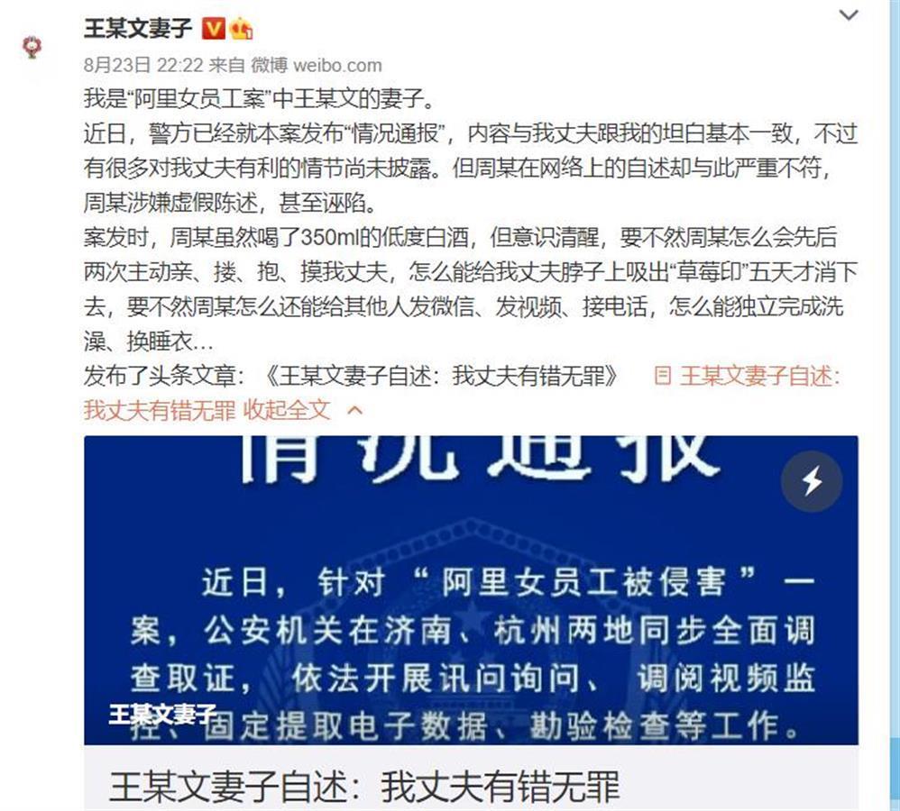“阿里女员工被侵害”案发生后,王某文妻子作为当事人家属站了出来。