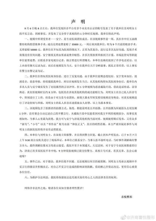 认证为济南喜悦整形医院官方微博的微博用户“济南喜悦整形”,于9月7日上午发布了一则声明。