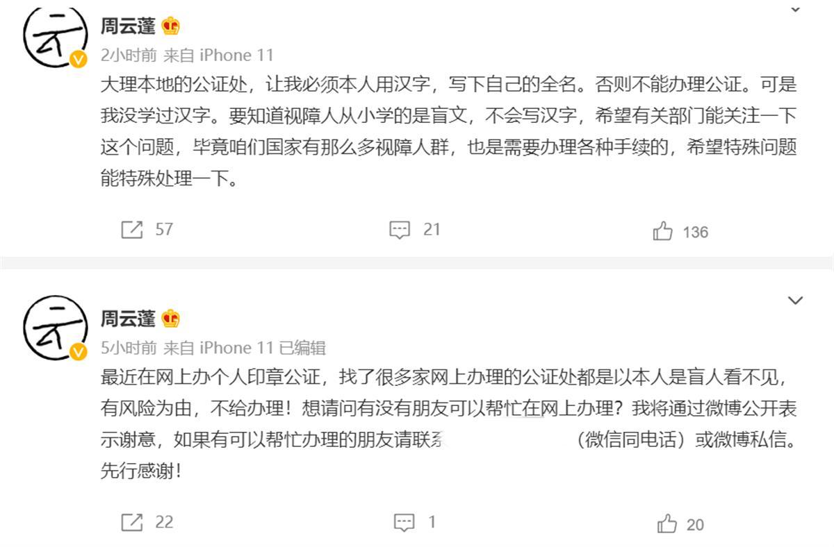 7日下午,周云蓬发布微博称,云南大理的公证处让他必须用汉字写下全名,否则不能办理公证。周云蓬在微博中表示:“我没学过汉字,视障人群从小学的是盲文,不会写汉字。”他希望有关部门能关注该问题。