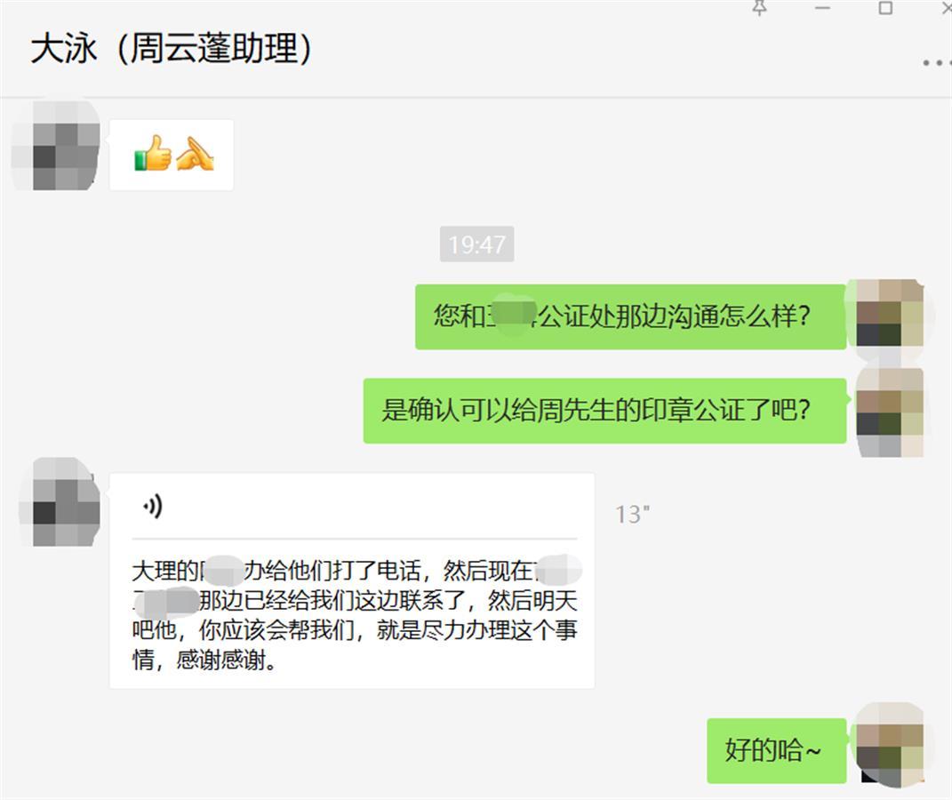 与大理一公证处工作人员聊天记录(周云蓬助理大泳提供)