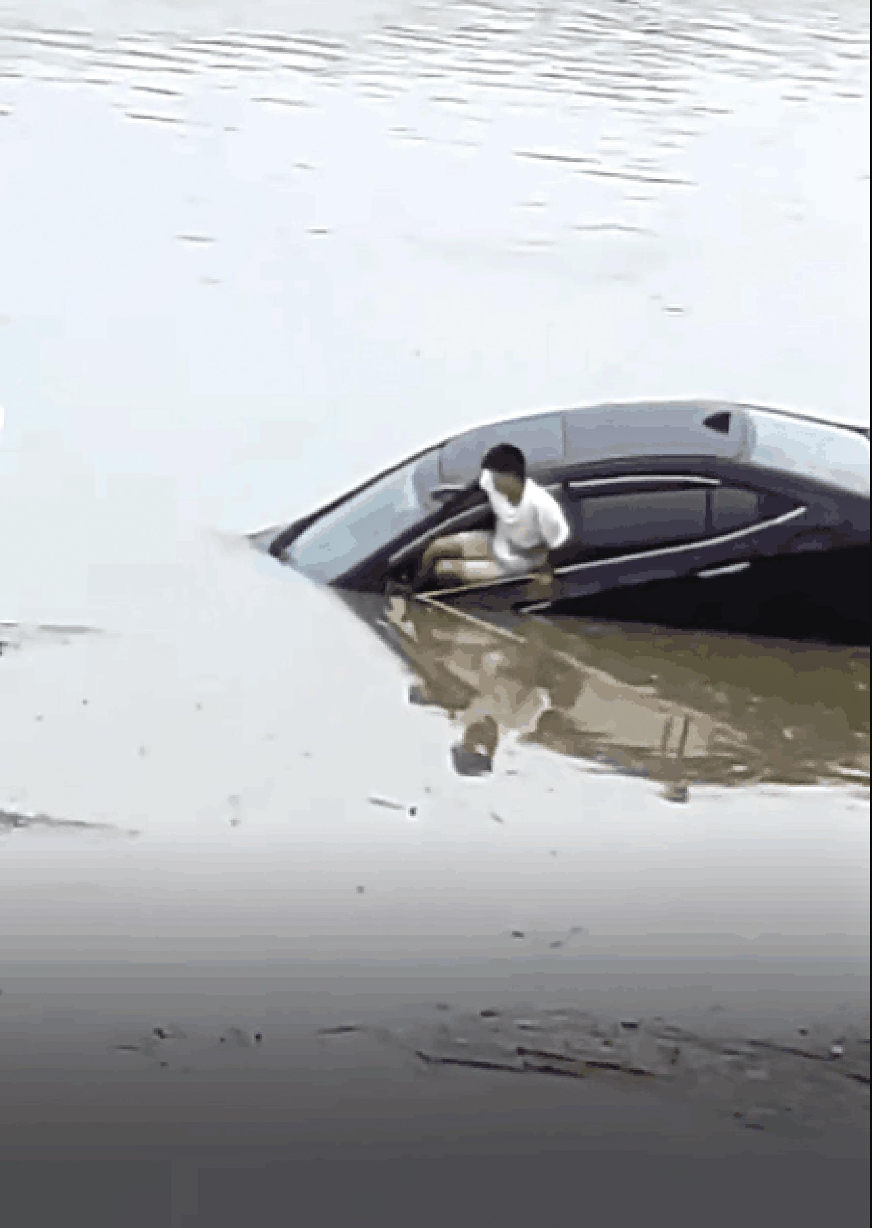 在周先生和其他群众喊了几秒钟后,男子慢慢地从驾驶室窗户里爬出来,用手扒着车窗。“后来车完全沉下去了,男子就在水里挣扎,要不是有人及时跳下去把他救了上来,估计他就凶多吉少了。”