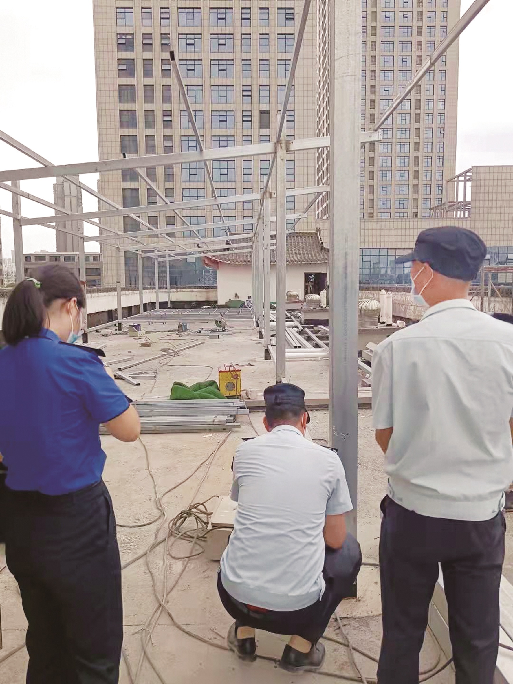 但一个小时后,执法队员再次到现场查看情况,发现4楼楼顶仍在抢建。原来,该会馆准备在客房区楼顶安装一套光伏发电系统,却假借安装光伏发电设备名义抢建房子。执法队员现场拍照取证测量,违建面积达231.5平方米。