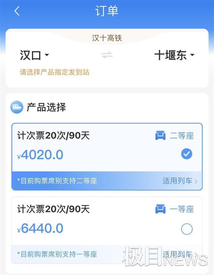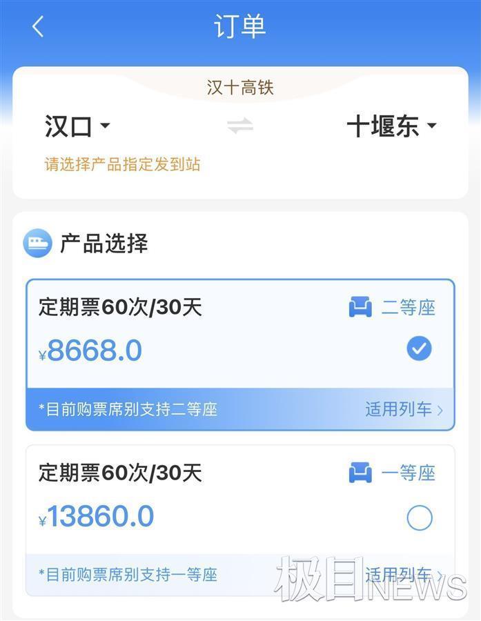点击“去下单”,记者分别看到,汉十高铁(汉口-十堰东)定期票为60次/30天,二等座票价8668元,一等座票价为13860元;同样是汉口-十堰东,计次票为20次/90天,二等座票价为4020元,一等座票价为6440元。
