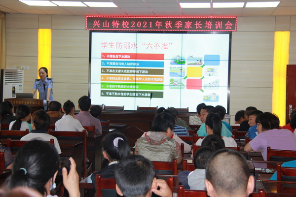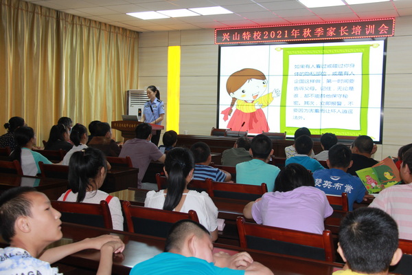 9月8日,兴山特校开展新学期首次家长学校授课活动。邀请法制副校长、公安局网监大队教导员胡学连及交警大队事故秩序中队胡开全,以“校园安全”为主题,采用生动的课件和现实案例,为全体家长和学生解答“如何防溺水”“面对校园欺凌怎么办”“怎样防性侵”“如何防拐卖”等威胁青少年健康成长的安全问题。“我知道穿背心和裤衩的地方不能让人碰”“不能随便跟陌生人走,也不能喝陌生人给的饮料”,面对“警察叔叔”的提问,孩子们争相回答。