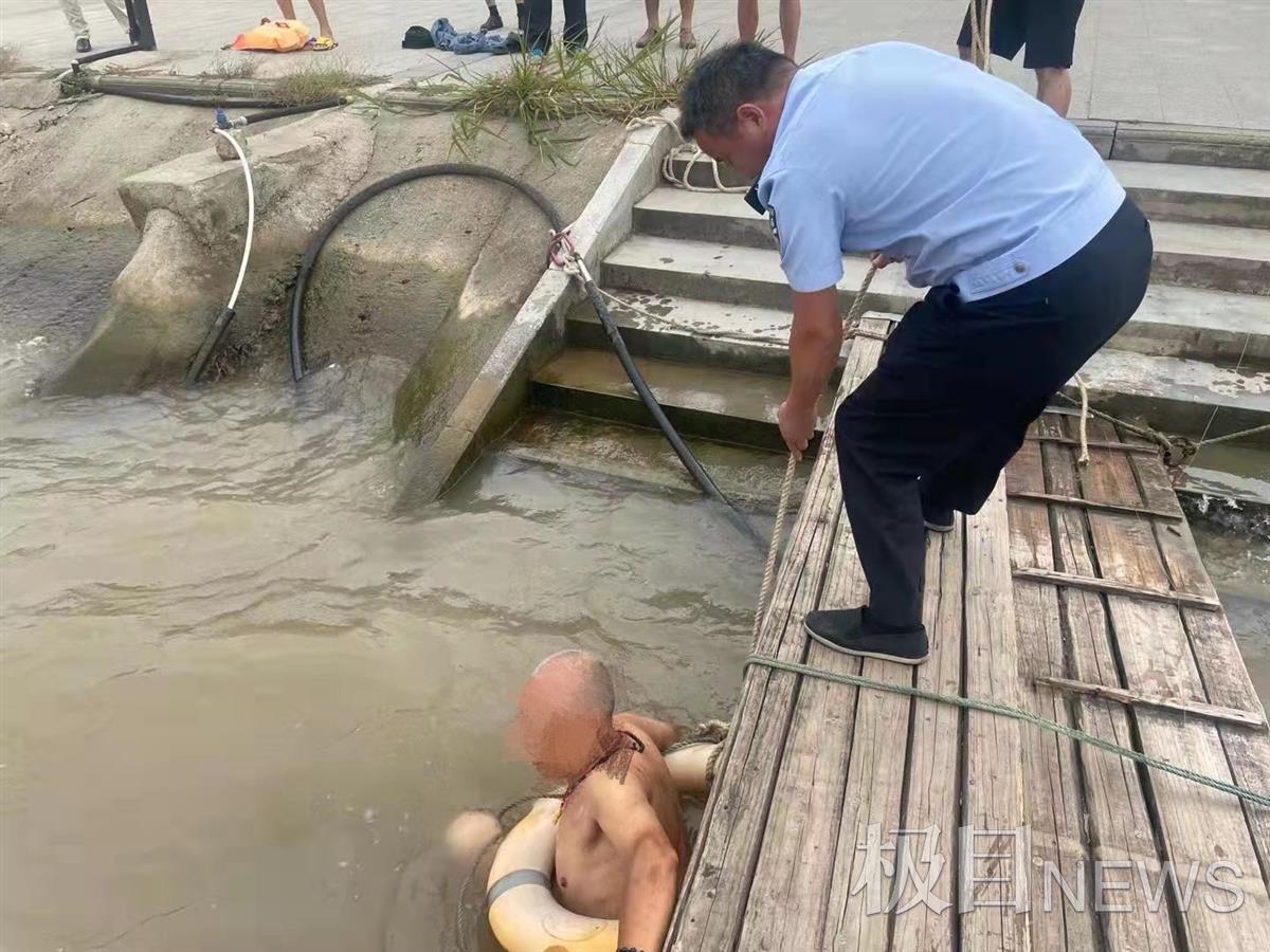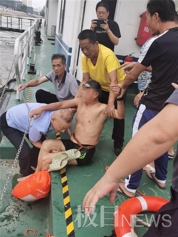 此时,老人两手艰难抓住趸船缆绳在水中飘荡,体力已渐渐不支。杨爱国顾不上被晒得滚烫的船沿,俯下身体指挥着船员和落水者相互配合救援。